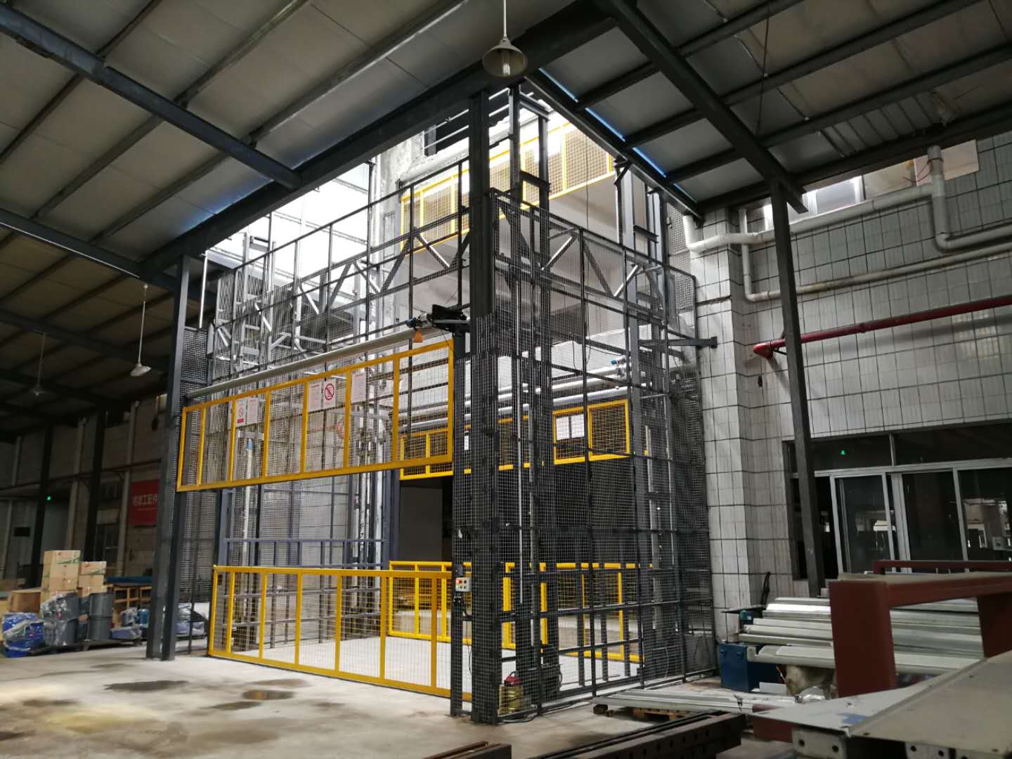 四柱式升降平臺采用了四角立柱+液壓油缸+板式鏈條+鋼絲繩等4重安全防護,且各樓層間設有限位開關及緩沖設備,緩解了升降平臺到達制定樓層時的緩沖力,且平臺設有緊急停止按鈕、緊急下降按鈕等,為各類突發事項做好了萬全準備。